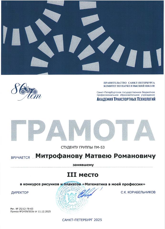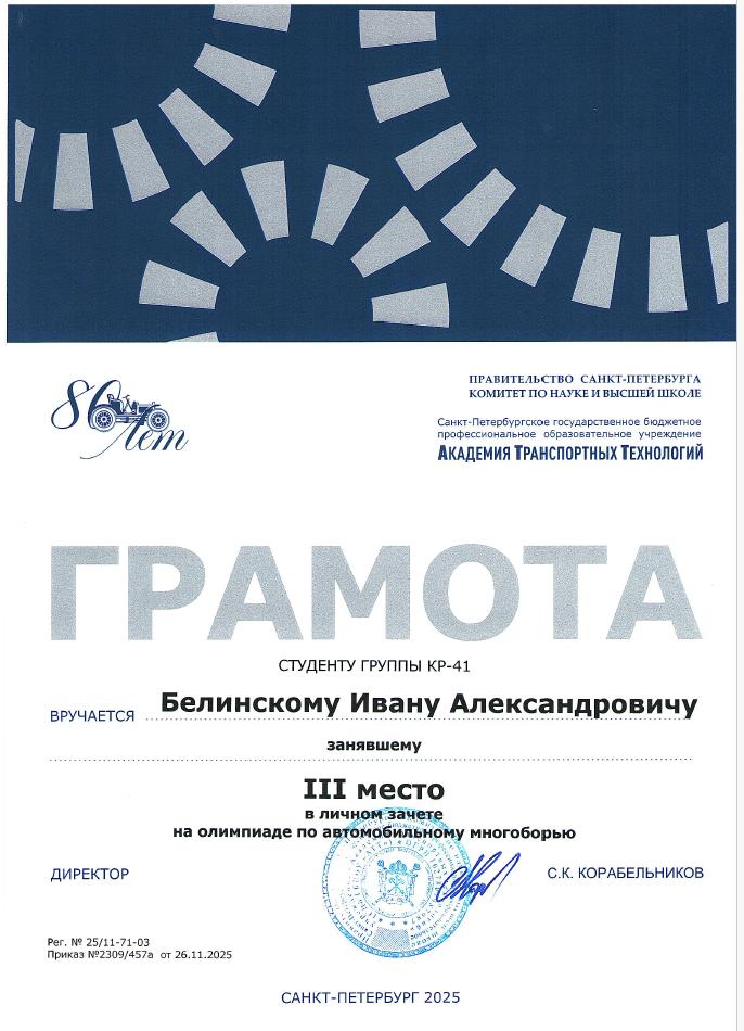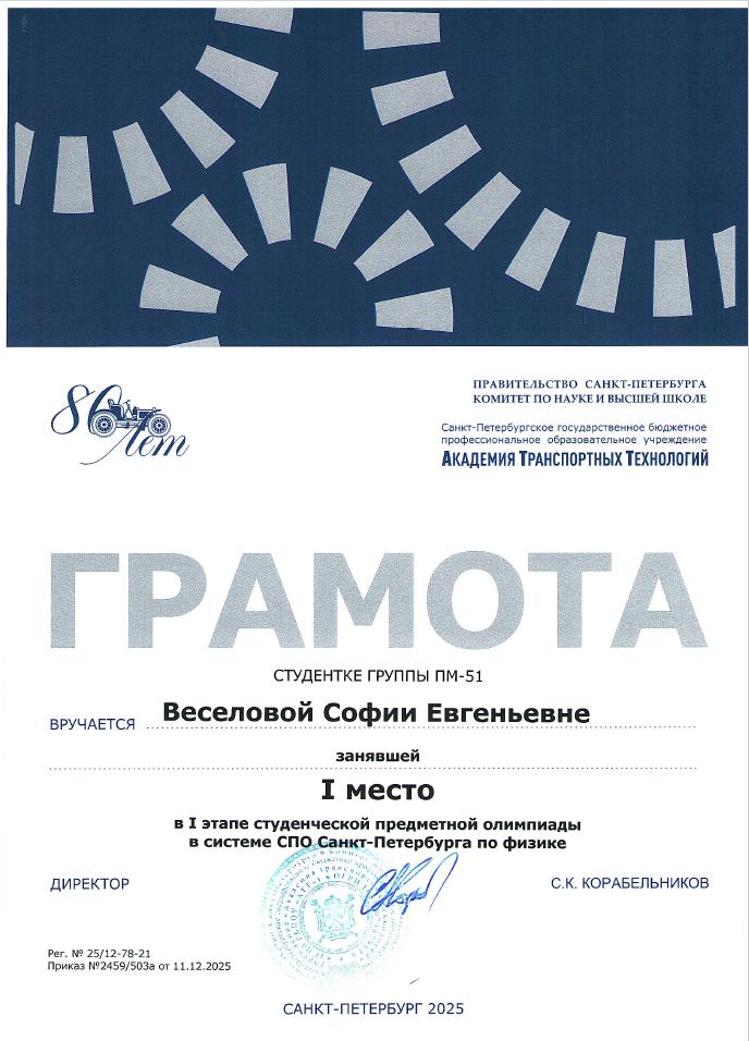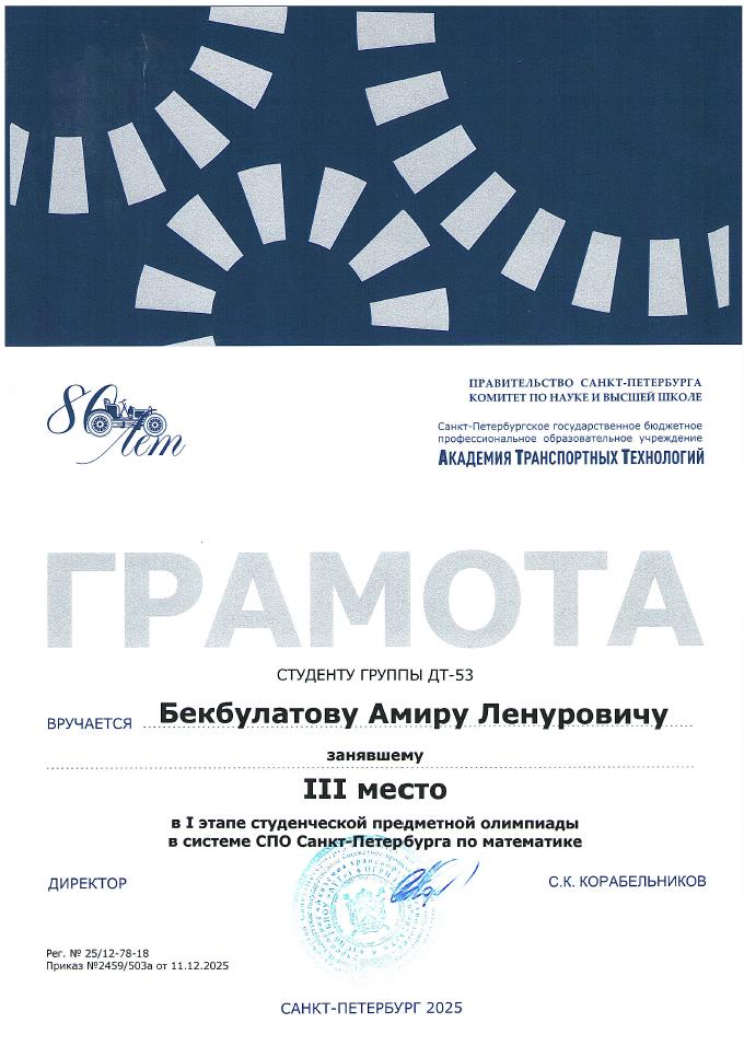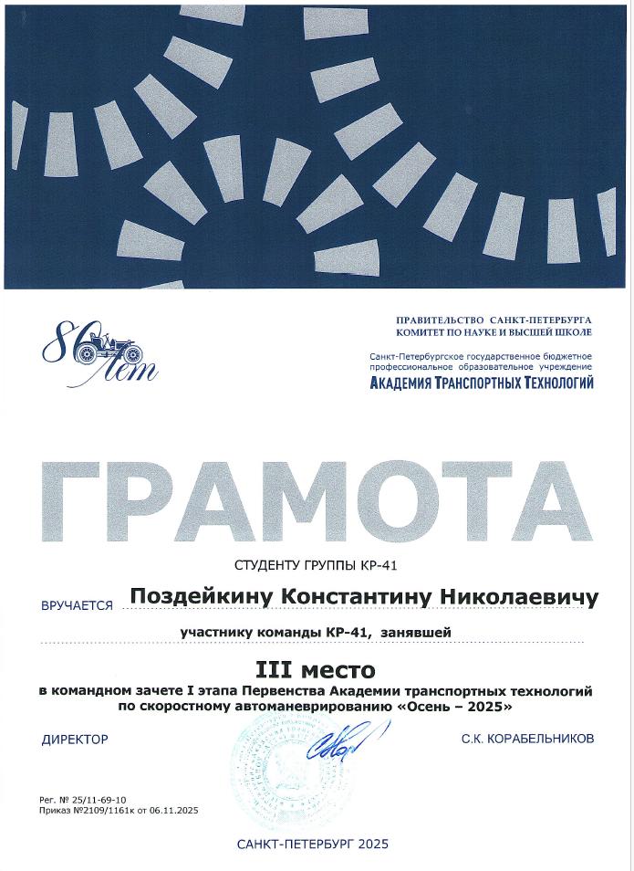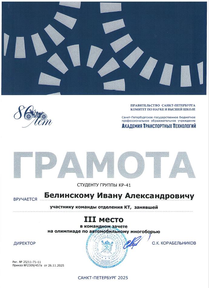 Благодарственное письмо за высокий профессионализм вклад в подготовку призера Чемпионата Профессионалы  Историко-патриотический конкурс Межрегиональной конференции Сенявинские чтения  Литературно-вокальный конкурс 900 дней  Литературно-вокальный конкурс 900 дней Академия транспортных технологий Профессионалы  Академия транспортных технологий Профессионалы  Городской конкурс Вызовы цифровой трансформации Всероссийский конкурс Большая перемена  Всероссийский конкурс Большая перемена  Щербаковская олимпиада профессионального мастерства Щербаковская олимпиада профессионального мастерства Щербаковская олимпиада профессионального мастерства  Олимпиада по химии   Олимпиада по математике   Олимпиада по математике   Олимпиада по математике  Конкурс рисунков и плакатов Математика в моей профессии  Олимпиада по математике  Физика сквозь призму современного автомобиля   Физика сквозь призму современного автомобиля   Физика сквозь призму современного автомобиля   Физика сквозь призму современного автомобиля   Физика сквозь призму современного автомобиля   Физика сквозь призму современного автомобиля   Олимпиада по физике   Олимпиада по физике  Олимпиада по физике Декада ЦК №1  Городской студенческий Городской студенческий конкурс видеопоэзии Городской студенческий конкурс видеопоэзии  Академия транспортных технологий Городской студенческий конкурс видеопоэзии  Городской студенческий конкурс видеопоэзии  Академия транспортных технологий Городской студенческий конкурс видеопоэзии  Городской студенческий конкурс видеопоэзии  Академия транспортных технологий Городской студенческий конкурс видеопоэзии  Городской студенческий конкурс видеопоэзии  О конкурсе Благодарственное письмо MatCat  Диплом координатора площадки MatCat  Диплом координатора площадки MatCat Новость Благодарность эксперту демонстрационного экзамена  Благодарность Академия транспортных технологий Конкурс профессионального мастерства Путь к комфорту   Конкурс профессионального мастерства Путь к комфортуКонкурс профессионального мастерства Путь к комфорту  Конкурс профессионального мастерства Путь к комфорту Конкурс профессионального мастерства Путь к комфорту Конкурс профессионального мастерства Путь к комфортуКонкурс профессионального мастерства Путь к комфортуНовостьБережливое будущее  Бережливое будущее Новость Всероссийский конкурс Безопасная дорога – детямНовость Диплом Молодёжный фестиваль Студенческий марафон Академия транспортных технологий