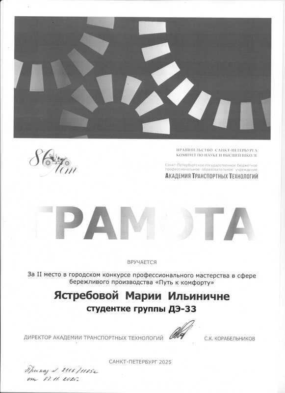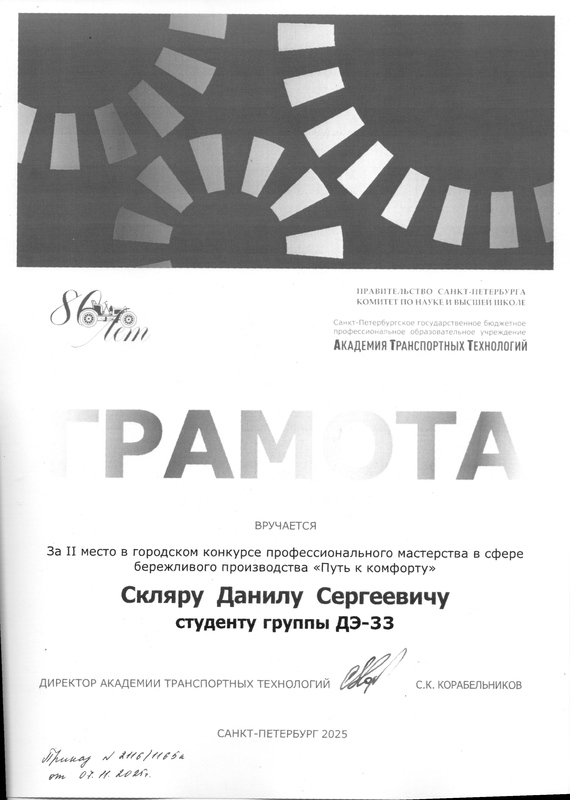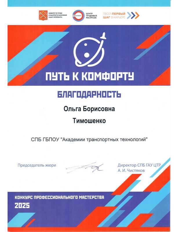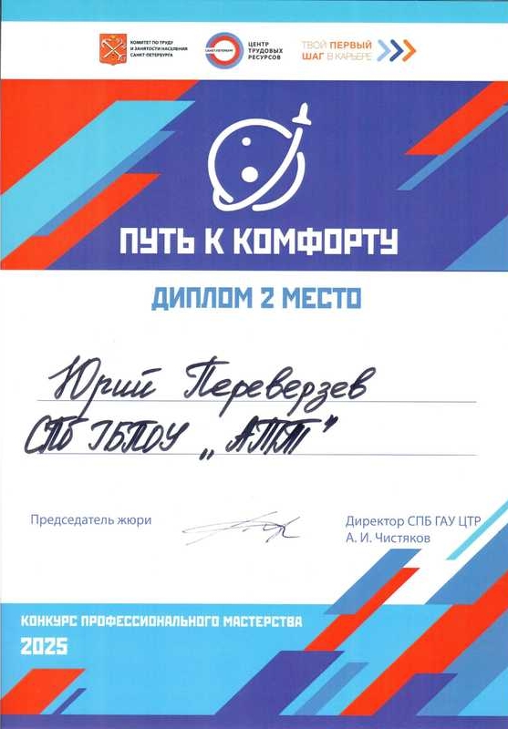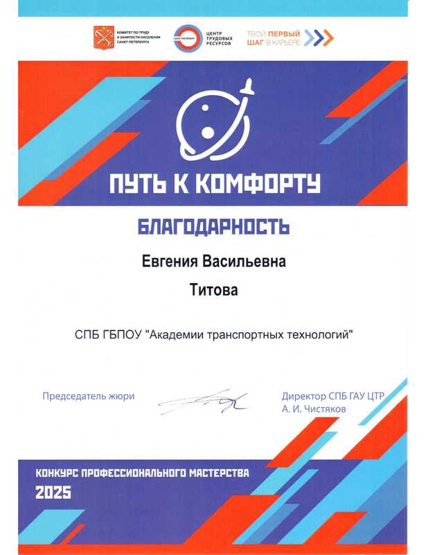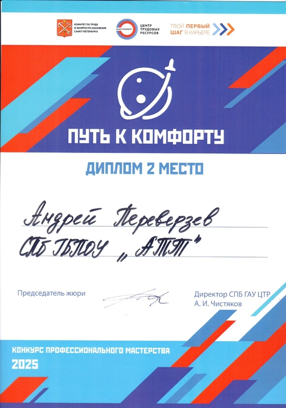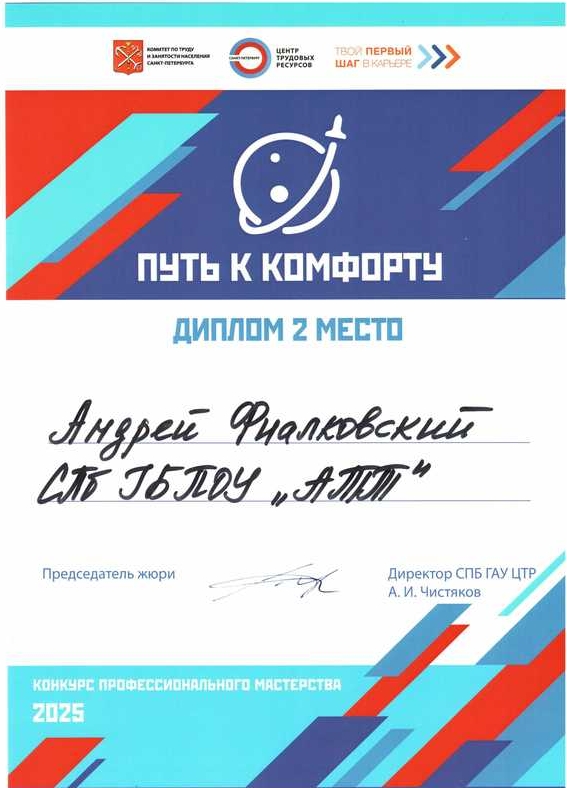 II место на конкурсе профессионального мастерства "Путь к комфорту"06 ноября на площадке "Точка кипения ГУАП" состоялась торжественная церемония награждения победителей конкурса профессионального мастерства "Путь к комфорту"! Это масштабное соревнование собрало студентов из 7 образовательных организаций, обучающихся в сфере пассажирских перевозок, чтобы выявить лучших в своем деле. Организатором конкурса выступил Санкт-Петербургский Центр трудовых ресурсов по поручению Комитета по труду и занятости населения Санкт-Петербурга в рамках проекта "Твой первый шаг в карьере". Команда Академии транспортных технологий заняла почетное II МЕСТО! Это блестящий результат, который стал возможен благодаря упорному труду, профессионализму и невероятному командному духу наших студентов. За честь АТТ выступали настоящие профессионалы своего дела: Наставники - мастера производственного обучения: Титова Е.В., Тимошенко О.Б.