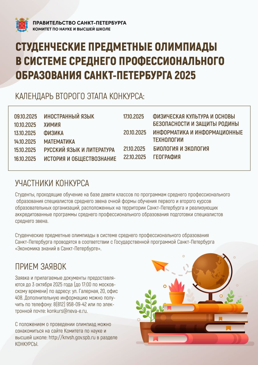 Студенческие предметные олимпиады в системе СПО Санкт-ПетербургаСПб ГБПОУ «Академия транспортных технологий» приглашает студентов профессиональных образовательных учреждений Санкт-Петербурга принять участие во втором (финальном) этапе студенческой предметной олимпиады в системе среднего профессионального образования Санкт-Петербурга по географии Регламент проведения олимпиады: Дата проведения: 22 октября 2025 г. Начало регистрации: 9:30 Место: СПб ГБПОУ «Академия транспортных технологий» Проезд и питание участников и сопровождающих осуществляется за свой счет. Подробная информация о Конкурсе на сайте Комитета по науке и высшей школе в разделе КОНКУРСЫ, а также на сайте кнвш.рф (в том числе результаты олимпиады) Контактное лицо: преподаватель Григорьева Екатерина Александровна тел. +7 921 865-39-41 Студенческие предметные олимпиады в системе СПО Санкт-Петербург в 2025 году Распоряжение КНФШ от 02.09.2024 №162 "О внесении изменений в Распоряжение КНФШ от 14.06.2016 №54" Распоряжение КНВШ от 31.08.2017 №122 "О внесении изменений в распоряжение КНВШ от 14.06.2016 №54"