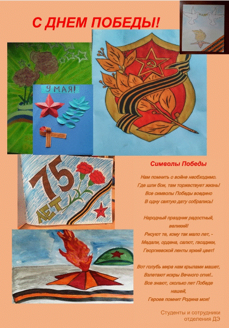 В преддверии празднования 75-летия Победы нашего народа в Великой Отечественной войне среди студентов отделения ДЭ прошла патриотическая акция «Символы Победы». Ребята в ней приняли активное участие.