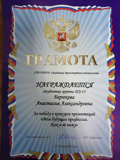 Поздравляем Анастасию с победой и желаем успехов в выбранной профессии.
