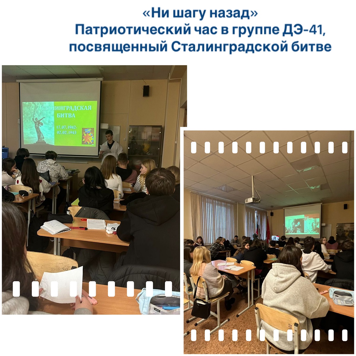 2 февраля ежегодно отмечается День воинской славы России — День разгрома советскими войсками немецко-фашистских войск в Сталинградской битве. В группе ДЭ-41 прошел патриотический час «Ни шагу назад», посвященный Сталинградской битве. Это сражение внесло решающий вклад в достижении коренного перелома в Великой Отечественной войне. Отныне советские вооружённые силы захватили стратегическую инициативу и удерживали её до конца войны. Поражение немецко-фашистского блока подорвало доверие к Германии со стороны её союзников и способствовало активизации движения Сопротивления в странах Европы. Будем помнить имена защитников Сталинграда, будем помнить и тех, чьи имена уже вряд ли можно установить — но всех, кто внёс вклад в освобождение не только города, но и мира от фашистской чумы.