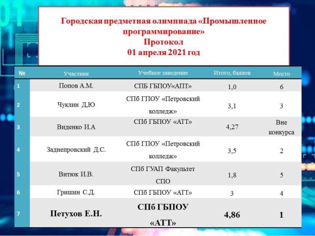 Эксперты и члены жюри, проверив работы студентов, приняли такое решение: первое место присвоено студенту нашей академии Петухову Егору (гр. ДН-81), второе и третье место заняли представители Петровского колледжа.