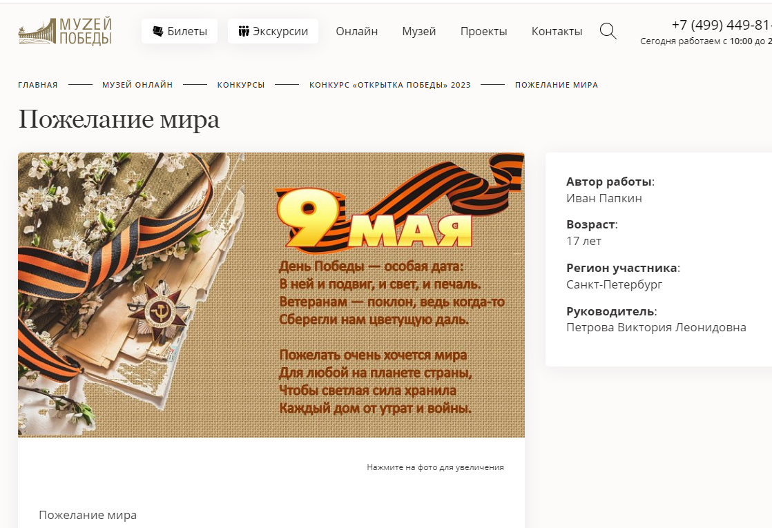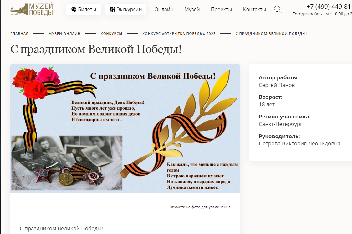 В период с 06 марта 2023 года по 16 мая 2023 года Федеральным государственным бюджетным учреждением культуры «Центральный музей Великой Отечественной войны 1941-1945 гг.» (Музей Победы) был организован и проведён международный конкурс «ОТКРЫТКА ПОБЕДЫ – 2023».