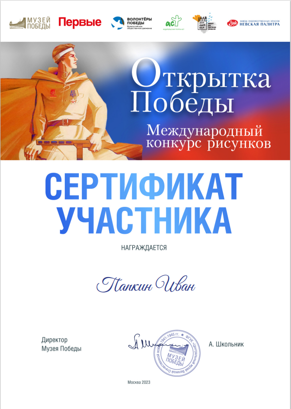 Папкин Иван и Панов Сергей, студенты академии, получили сертификаты участников международного конкурса «ОТКРЫТКА ПОБЕДЫ – 2023»