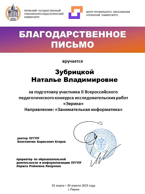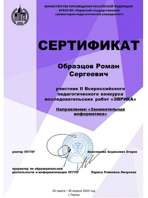 С 1 марта 2023 года по 30 апреля 2023 года факультет информатики и экономики, математический факультет и Центр профильного образования «Открытый университет» Пермского государственного гуманитарно-педагогического университета при информационной поддержке Министерства образования и науки Пермского края провели среди обучающихся 10 – 11 классов средних общеобразовательных школ и средних профессиональных образовательных организаций II Всероссийский конкурс исследовательских работ «Эврика».