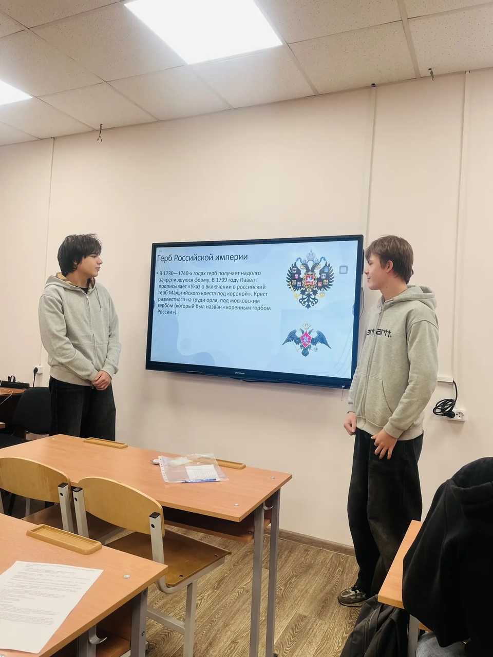 Классный час, посвященный Государственному гербу РФ2 декабря в группе ДВ-41 прошёл классный час в формате круглого стола, посвященный одному из главных символов государства — Государственному гербу Российской Федерации. Цель мероприятия заключалась в ознакомлении обучающихся с историей возникновения герба, значением каждого элемента символики и воспитании патриотизма среди подрастающего поколения. Начался доклад с рассказа студентов Тагиева Руслана и Антонова Егора о том, откуда появился двуглавый орёл на нашем гербе. Обучающиеся узнали, что этот символ пришёл к нам ещё из Византийской империи вместе с Софьей Палеолог, супругой Ивана III , и постепенно стал символом власти московских князей, а позже и всей русской державы. Для закрепить полученных знаний студенты приняли участие в викторине, в рамках которой разгадывали головоломки с изображением герба, определяли элементы символики на рисунках и даже пробовали самостоятельно нарисовать Государственный герб России. Формат круглого стола позволил обучающимся ближе познакомиться с Государственным гербом России, почувствовать себя частью большого и сильного государства, способствовал формированию чувства ответственности перед своим народом и страной. |