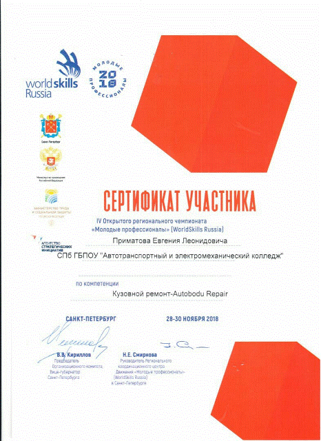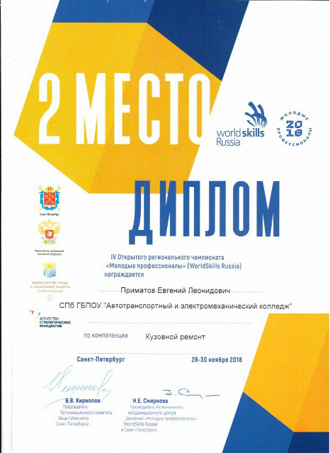 С 28 по 30 ноября 2018 года в Санкт-Петербургском техническом колледже проходил IV Открытый региональный чемпионат "Молодые профессионалы" (WorldSkillsRussia). В напряженной трехдневной борьбе почетное 2 место в компетенции "Кузовной ремонт - AutoboduRepair" занял Приматов Евгений (студент группы ДТ-32). Подготовил Евгения к конкурсу преподаватель Чистяков А. Н. Вместе с Приматовым Евгением к участию в конкурсе готовился Маркин Игорь, его одногруппник, надежный друг, раллист, болельщик.