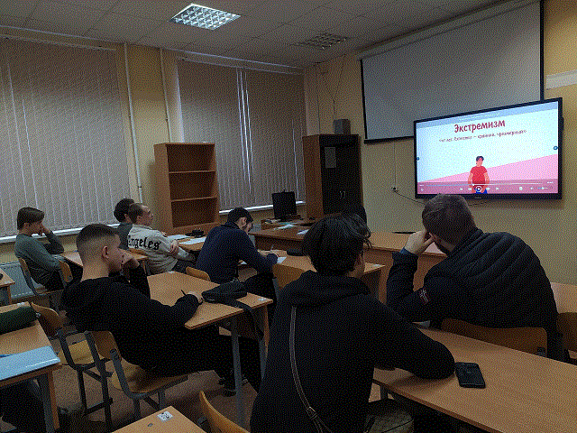 27.01.2025 г. прошел видеопоказ «Что такое экстремизм?27.01.2025 г. в группе КР-12 прошел видеопоказ «Что такое экстремизм? Ответственность заучастие в экстремистских акциях». Студенты получили информацию об опасном для современного обществаявлении - экстремизме, ознакомились с понятием и видами экстремизма, а также с законодательством и мерами ответственности за совершённые преступления экстремистской направленности. Обсуждение темы вызвало интерес среди студентов. |